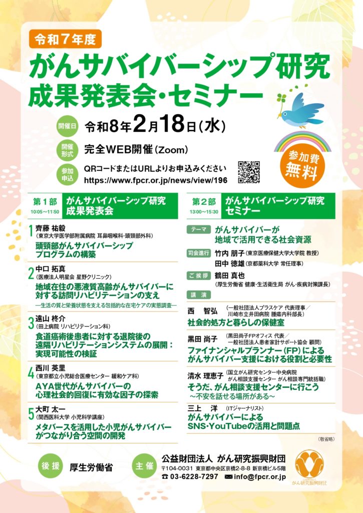 2月18日(水)に開催される「令和7年度がんサバイバーシップ研究成果発表会・セミナー」に当協会の顧問の黒田尚子氏が登壇します。