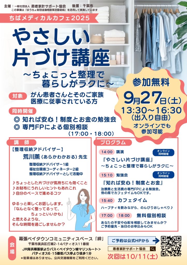 ちばメディカルカフェ2025の第一回目は、整理収納アドバイザーの荒川薫先生をお招きし、がん治療中に知っておきたい、片づけ講座を開催します。