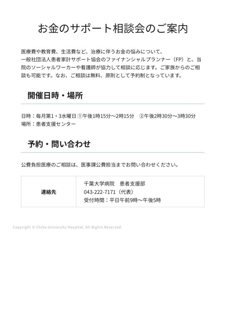千葉大学医学部附属病院の患者さんとご家族を対象に、千葉大学医学部附属病院にて「お金のサポート相談会」が定期開催されています。