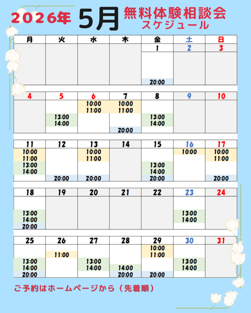 夜(20時)の枠や、土日の枠は早く埋まっちゃうので、ご希望の方はお早めがおススメです。